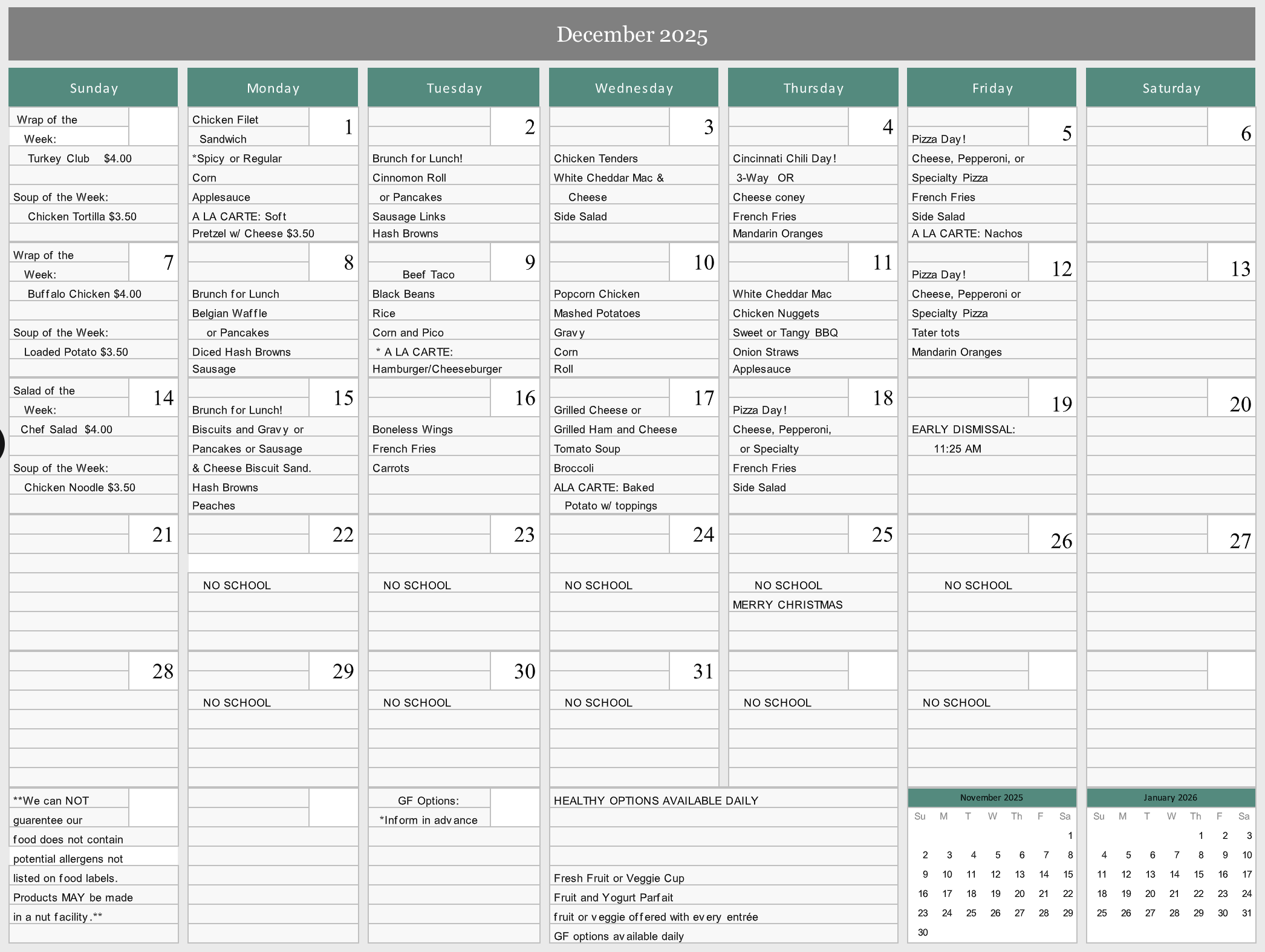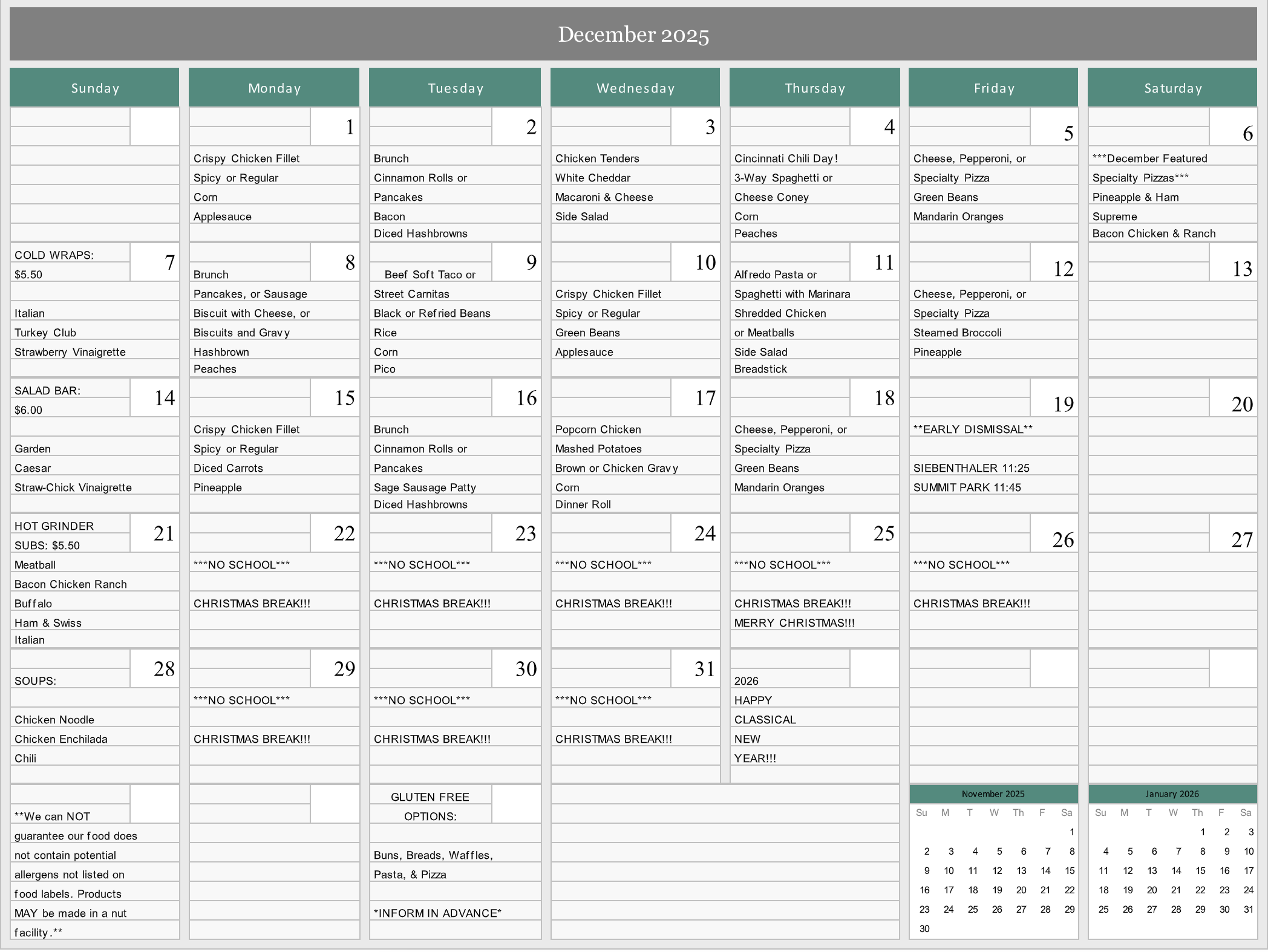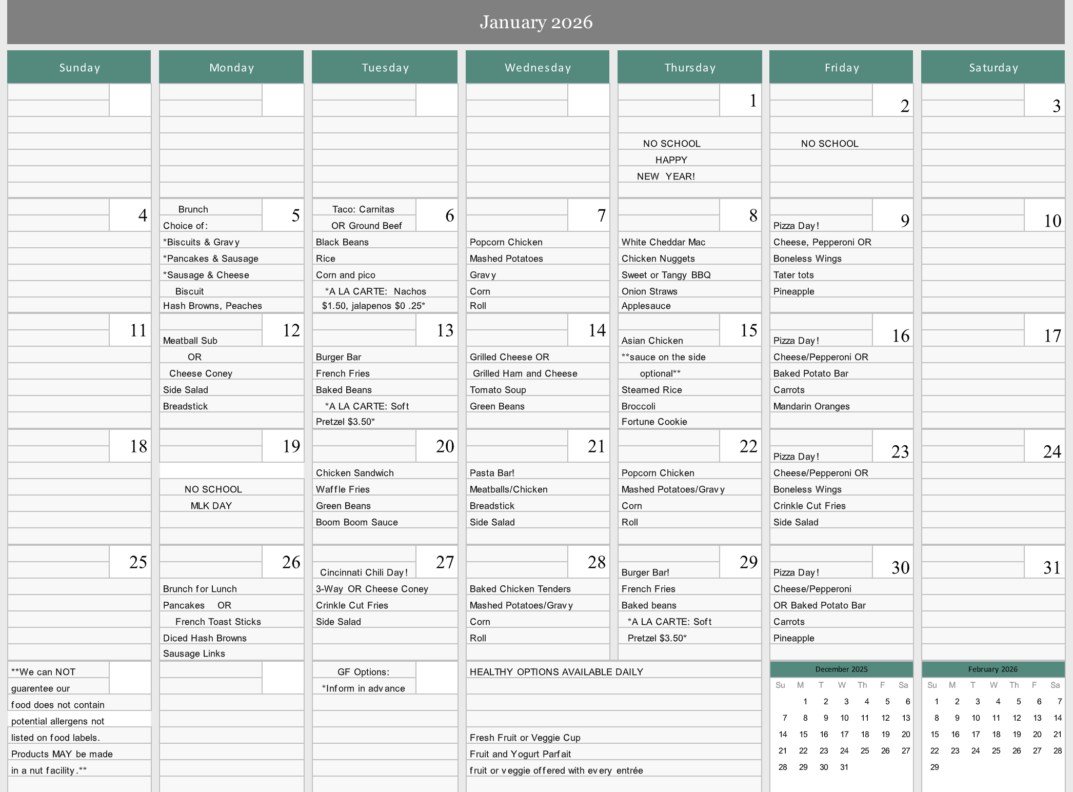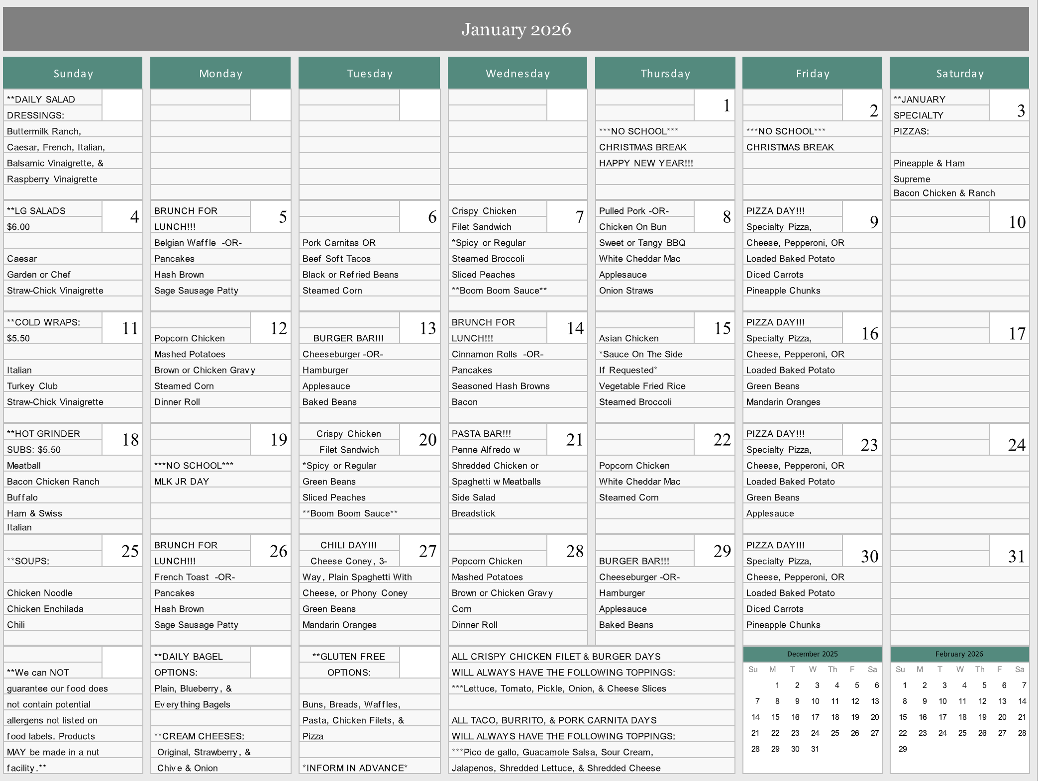 Each month, we will post the upcoming lunch calendar that will be offered to the students.
